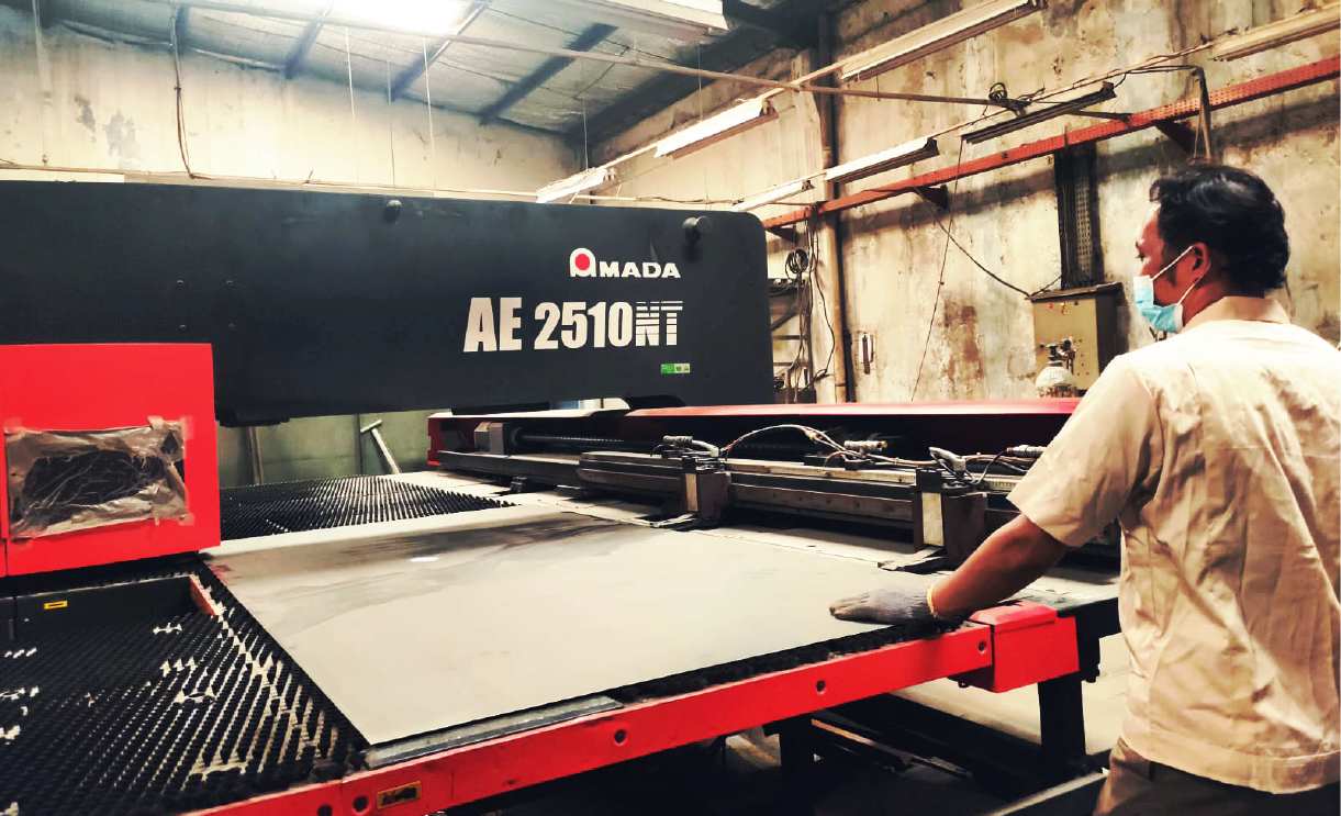 Pemotongan material menggunakan tools punch yang beragam bentuknya, juga proses forming dan embos, kami menggunakan mesin AMADA AE 2510NT.